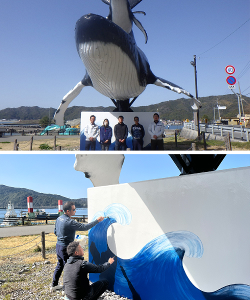 塗装・防水工事の専門業者として、地域貢献活動でクジラのモニュメントの架台の防水工事と塗装塗り替え修繕工事を行ないました。 なんと、今回の施工にご協力いただいた職人さんは、クジラのモニュメント新設時の施工に携わった職人さんなのです。 20年の時を得て、今回は息子さんと2人で波の特殊塗装を行なって頂きました。 親の代から子の代へ技術継承がなされ、業界の人手不足の波に負けない思い出の深い地域貢献活動となりました。